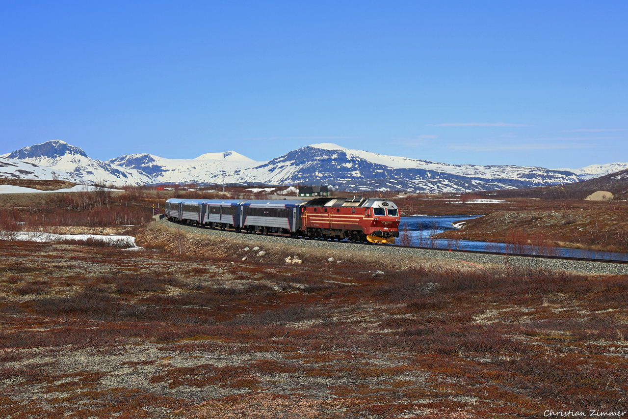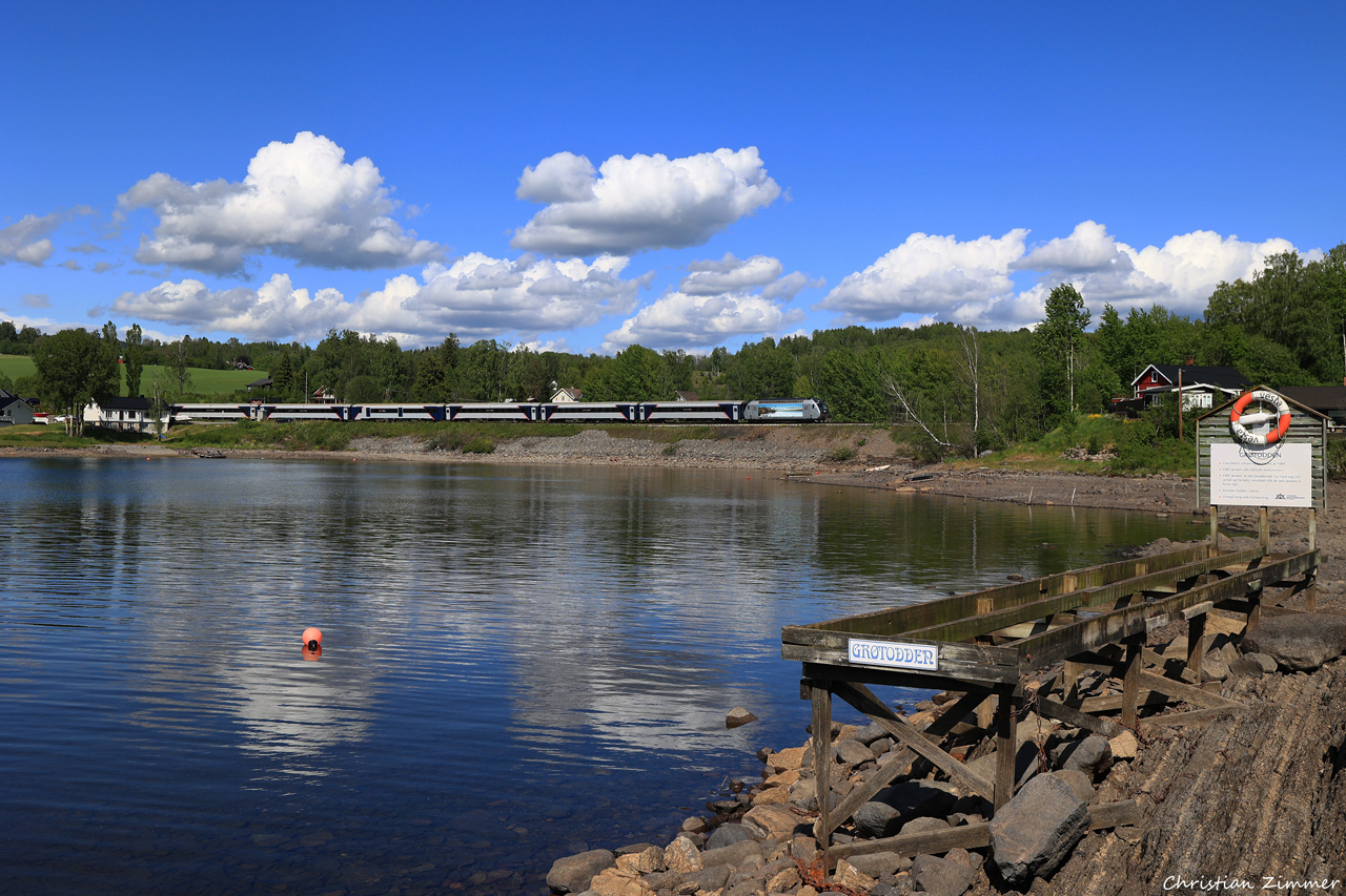 EL 18 2248 mit dem Ft 44 Trondheim - Oslo bei JessnesMit dem Erreichen der Nordlandsbahn ging ein persönlicher Traum in Erfüllung, wollte ich doch schon lange Zeit die beeindruckenden Di4 vor den durchgehenden Zügen von/nach Bodø erleben. Nachdem schon länger auf Grund von Lokmangel das Nachtzugpaar gestrichen wurde, sorgte ein Erdrutsch knapp vier Wochen nach unserem Besuch für die bis heute andauernde Einstellung des Verkehres. Mit Wiedereröffnung der Strecke im kommenden Jahr sollen dann nach langer Suche neue Eurodual aus dem Hause Stadler die Dienste übernehmen. Ob und wie die Di4 zurückkehrt ist also mehr als fraglich: