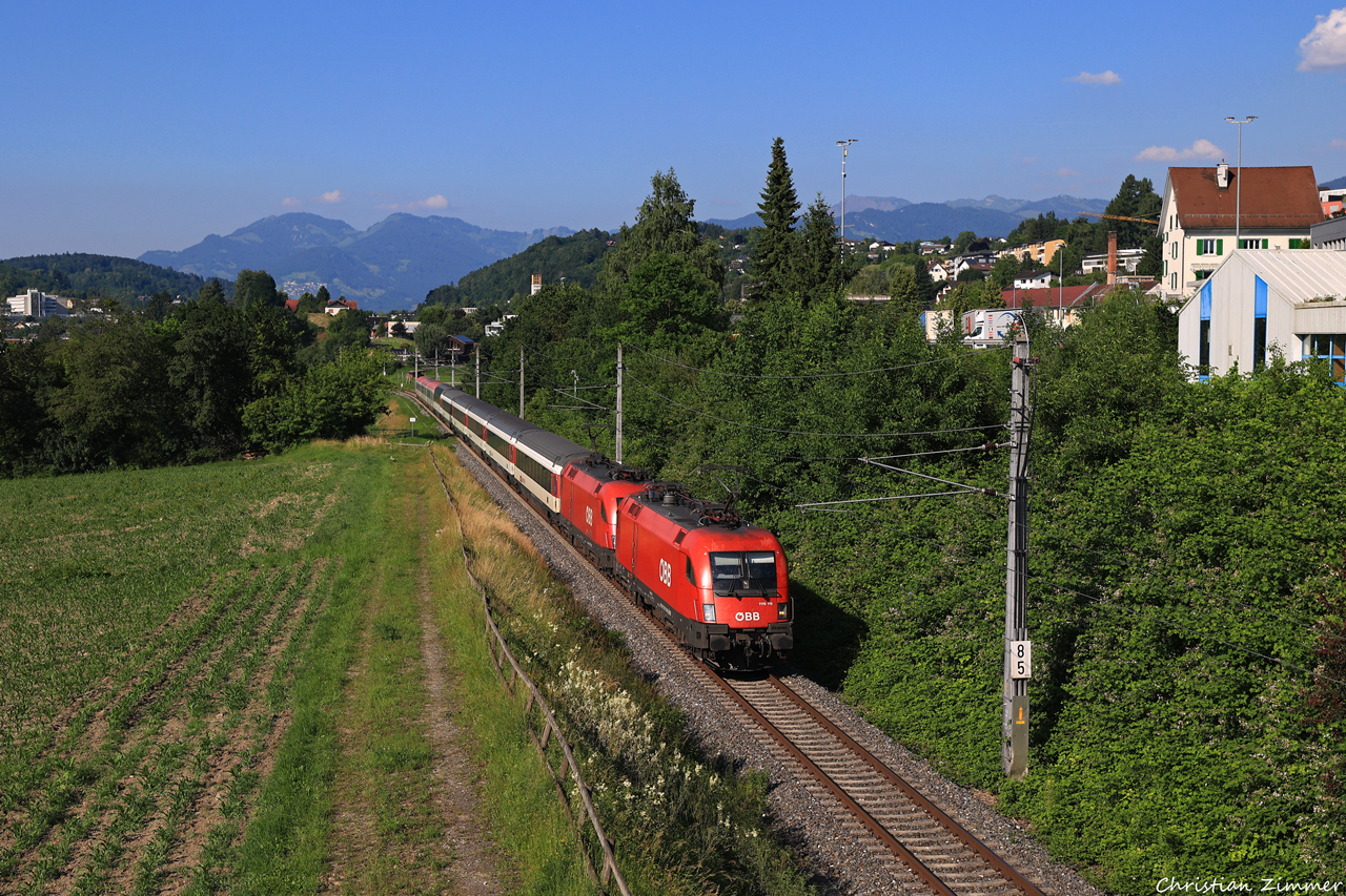 1116 119+163 passieren mit dem EC 164 "Transalpin" Graz Hbf - Zürich HB soeben die Landesgrenze Österreich - LiechtensteinIm Juli gelang mir dann die erste brauchbare Aufnahme eines ÖBB-Vectron an den RedBull-Zügen: