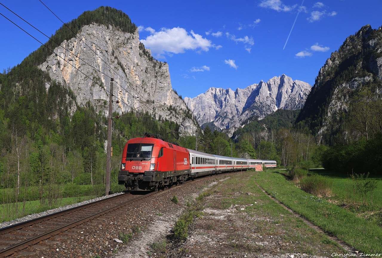 1016 027 durchfährt mit dem D 1014 "Gesäuse" Wien Hbf - Bischofshofen den ehemaligen Bahnhof Gesäuse Eingang.Zurück in der Heimat sorgten im Mai größere Verspätungen und Bauarbeiten für den ein oder anderen Güterzug bei Tageslicht: