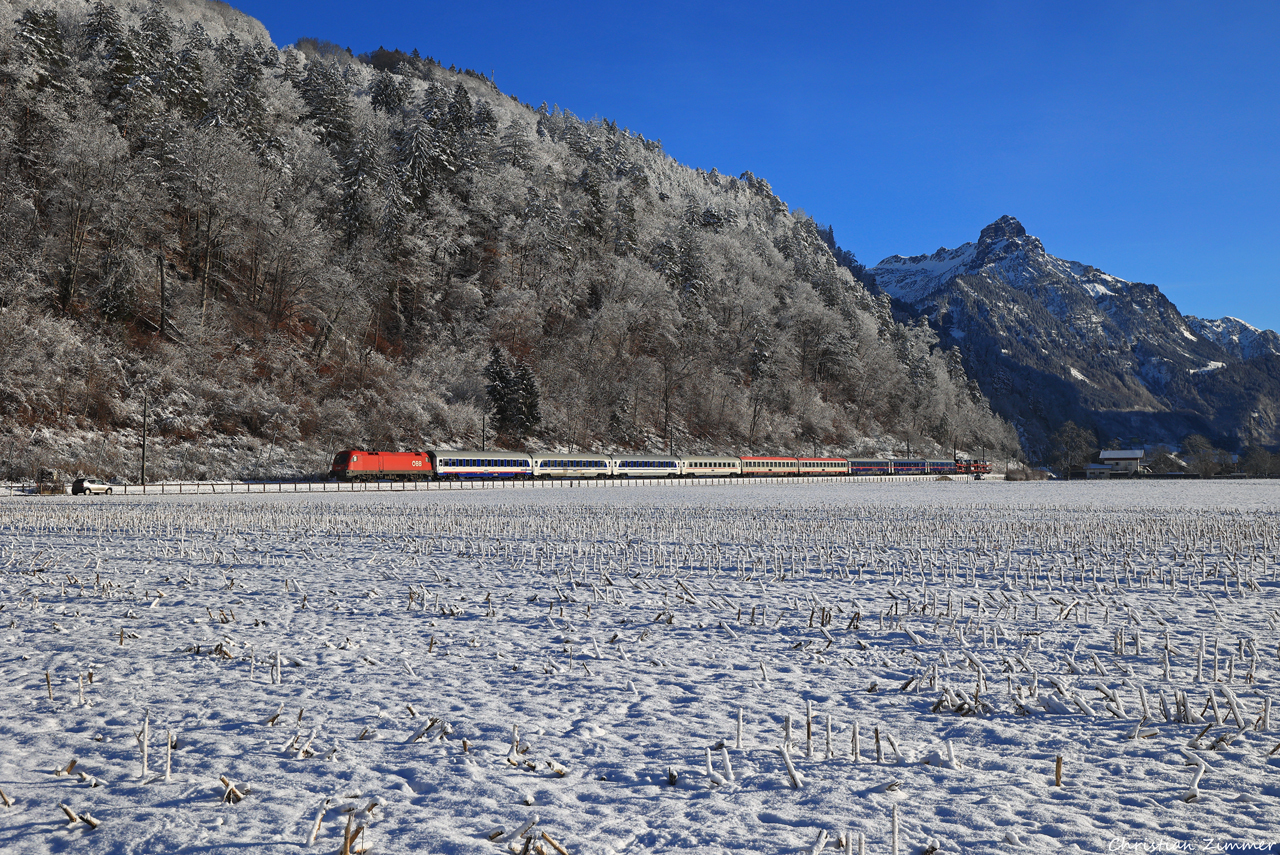 1116 194 mit dem NJ 1464 Graz Hbf - Zürich HB zwischen Bings und BludenzEnde Januar reiste ich dann mit dem Südbahn-ICE nach Biberach, da sich hier die 218 476 mit einer Übergabe für Biberach und Ummendorf angekündigt hatte: