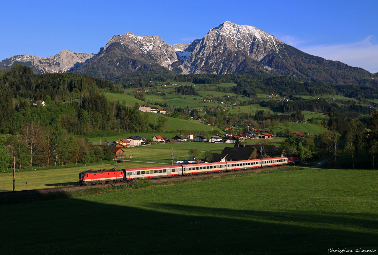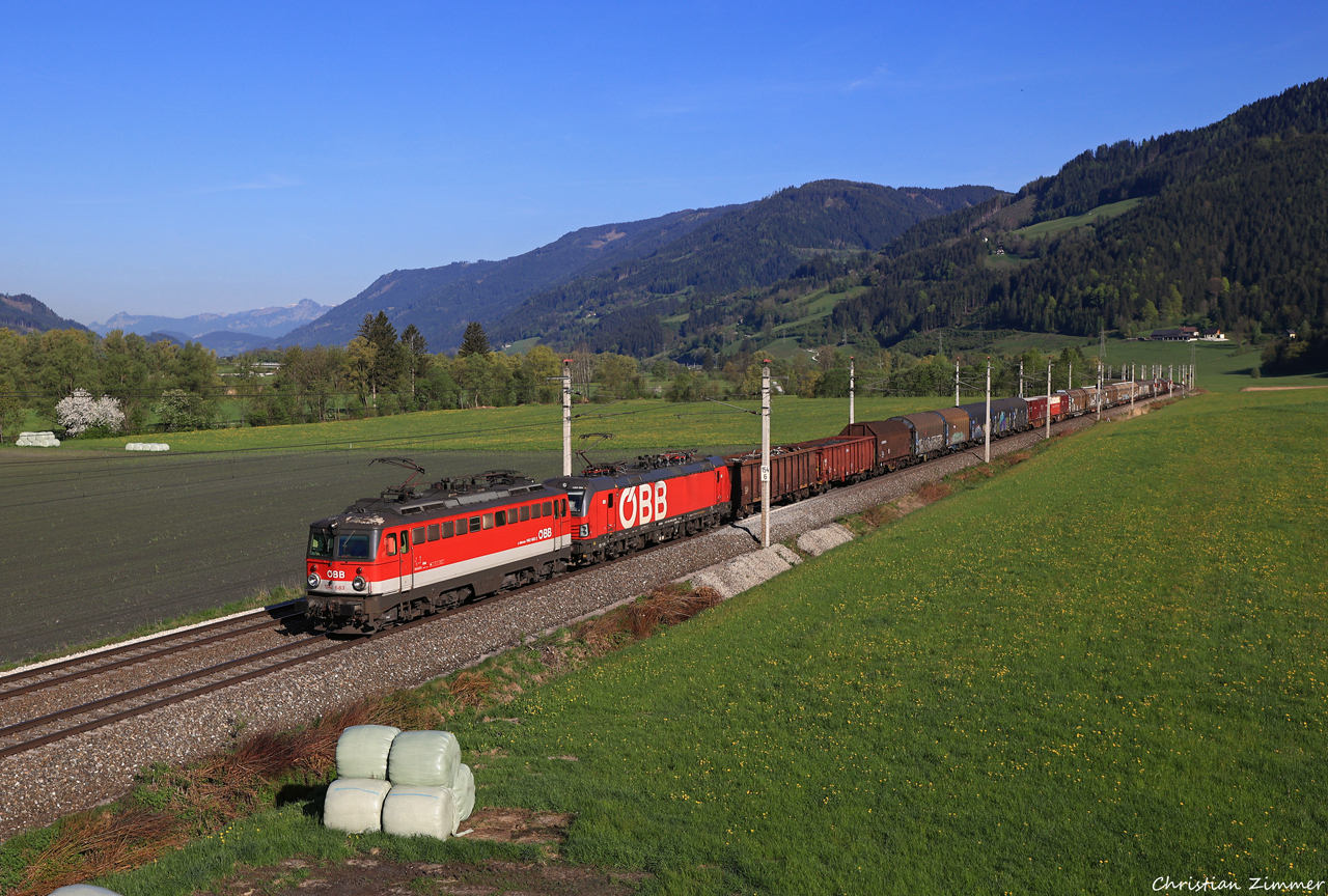 1142 683 und 1293 094 mit dem DG 54591 Linz Vbf-Ost Reihungsgr. - Villach Süd Gvbf Einfahrgr. kurz vor dem Bahnhof Trieben. Zwischen den Abnahmen der beiden Loks liegen fast 50 JahreAm gleichen Tag befuhr auch einer der wenigen Fernverkehrszüge im Jahr die Strecke durch das Gesäuse. Gebildet war der Zug aus gemieteten IC1-Wagen der DB, deren Einsätze in Österreich im Laufe des Jahres endeten: