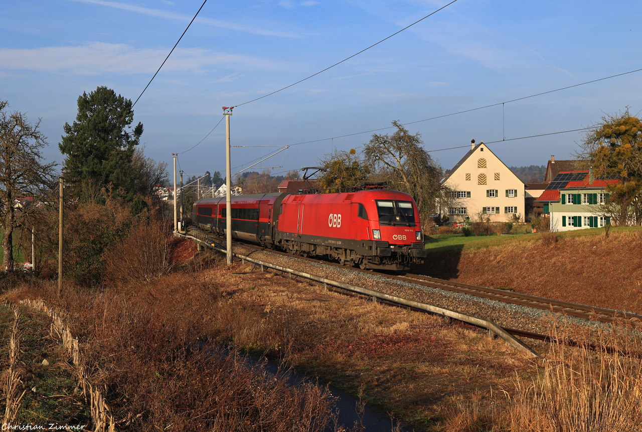 1144 269 steht mit dem D 665 Bregenz - Innsbruck Hbf zur Abfahrt bereitDas letzte Foto vom Railjet entstand wenige Tage später an der bekannten Stelle in Enzisweiler, als nicht nur die Garnitur gedreht war, sondern auch mal wieder ein roter Taurus den Zug bespannte: