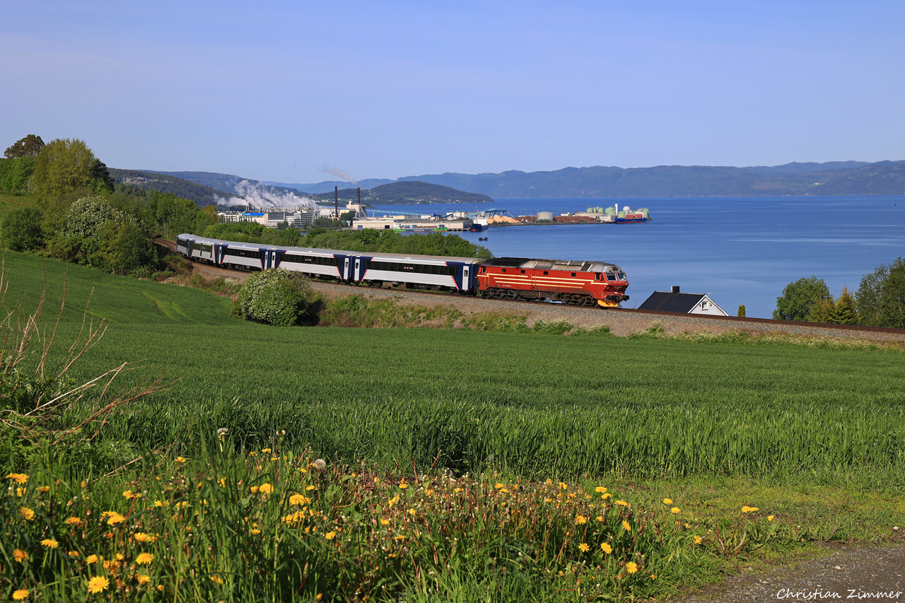 Hier war noch alles in Ordnung: Die Di4 665 passiert mit dem Ft 471 Trondheim - Bodø vor der Kulisse des Trondheimfjord bei Skogn die wartenden FotografenAm ersten Tag des Juni erreichten wir dann mit dem Polarkreis unser nördlichstes Ziel. Auch hier durfte eine Aufnahme der Di 4 nicht fehlen: