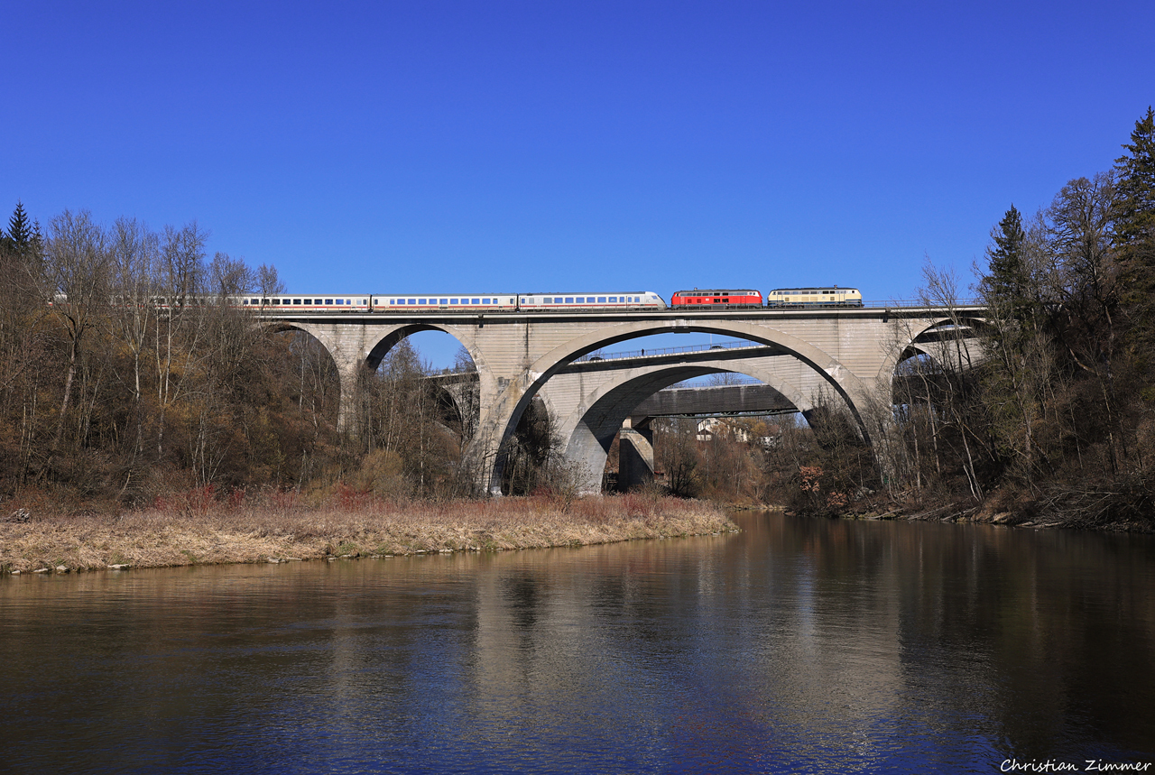 218 446 mit dem vorletzten IC 2085 bei LangenwangKurz danach starteten die Arlbergumleiter und abgesehen von den raren Güterzügen bei Tageslicht, stand der Transalpin im Hauptfokus: